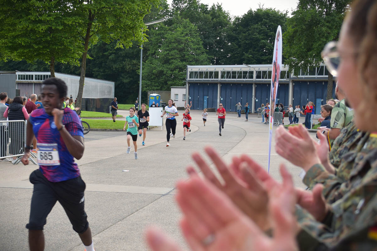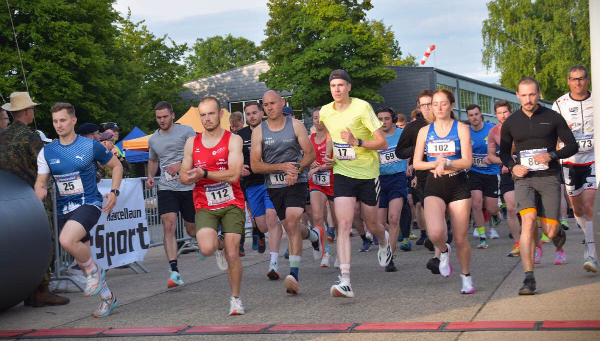 Der Start beim KAS-Feierabendlauf in der Hunsrück-Kaserne in Kastellaun – er beginnt in der Regel sehr verheißungsvoll. Gerade in den ersten Abschnitten macht es die besondere Streckencharakteristik mit ihrem leichten Gefälle den Läuferinnen und Läufern einfach, in Schwung zu kommen. Wenn dann auch das Wetterglück so mitspielt wie bei der diesjährigen, mittlerweile achten Auflage des Laufevents, steht der Jagd nach persönlichen Bestzeiten eigentlich nichts im Wege. Eigentlich – denn wenn die Wendepunktstrecke unter anderem an der ehemaligen Raketenbasis Pydna vorbei auf das Kasernengelände zurückführt, gilt es, die zuvor „verlorenen“ Höhenmeter wieder auszugleichen. Dementsprechend steht den meisten Läuferinnen und Läufern vor der Freude zunächst die Anstrengung ins Gesicht geschrieben, wenn sie mit der lautstarken Unterstützung des Publikums den Zielsprint gemeistert haben.