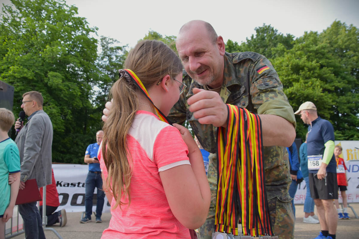 Mit viel Elan bei der Sache sowie stets im Zentrum des Geschehens präsentierte sich der Stellvertretende Kommandeur des in Kastellaun beheimateten Informationstechnikbataillons 282, Oberstleutnant Robin Achilles. Als zweitbester Bundeswehrangehöriger selbst erfolgreich über die Strecke von 5.000 m aktiv, nutzte er im Laufe des Abends zahlreiche Gelegenheiten, um die kleinen und großen Gewinnerinnen und Gewinner persönlich auszuzeichnen.