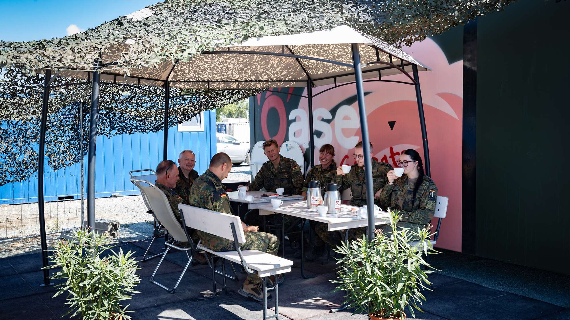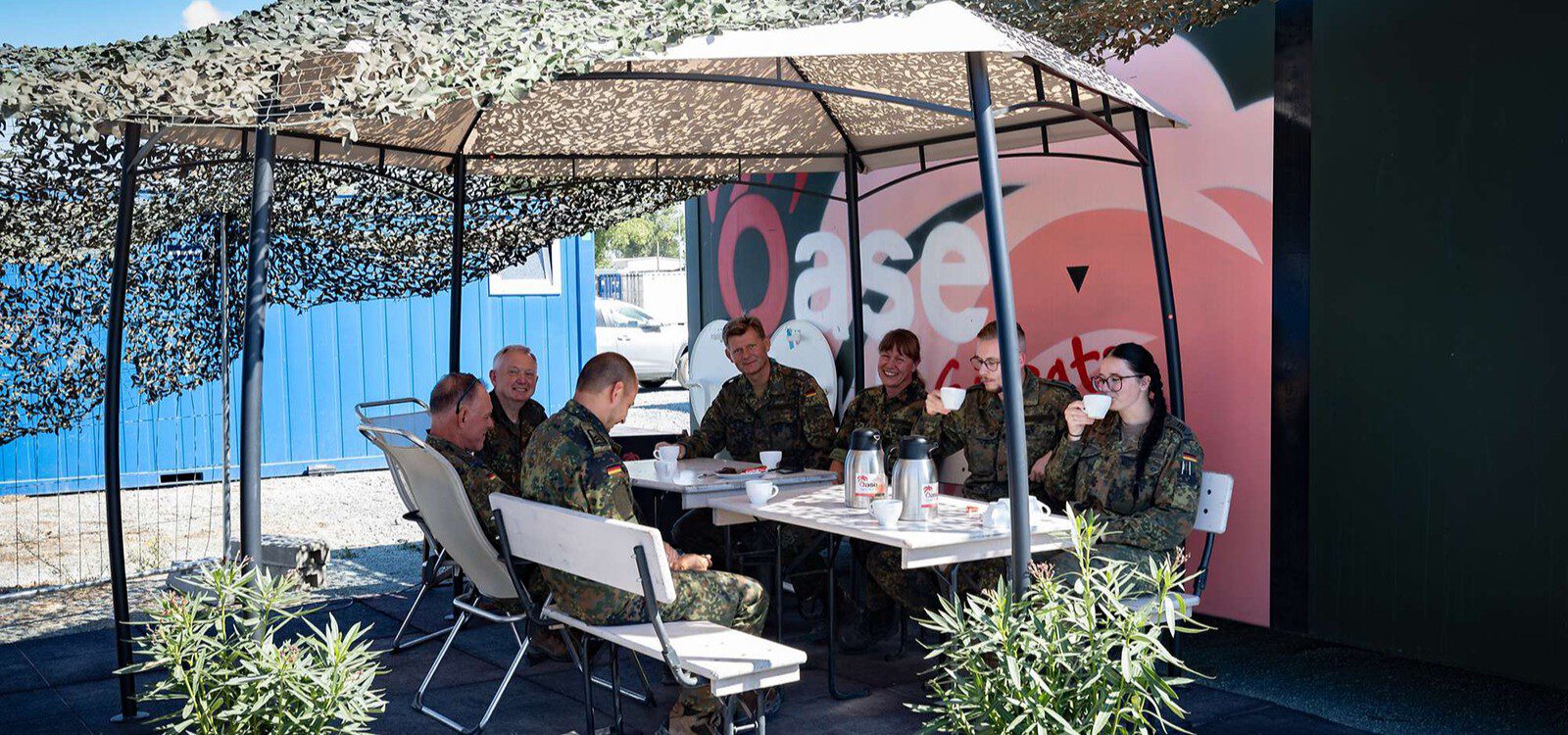Darüber hinaus beherbergt die OASE ein Büro für den zuständigen Militärseelsorger und dient gleichzeitig als geschützter Raum für vertrauliche Gespräche. Für Gemütlichkeit und kleine Wohlfühlmomente sorgt während der Sommermonate eine eigens eingerichtete Sitzecke unter Pavillon und Tarnnetz. An kälteren Tagen ermöglichen Sitzplätze im Inneren das Zusammenkommen.