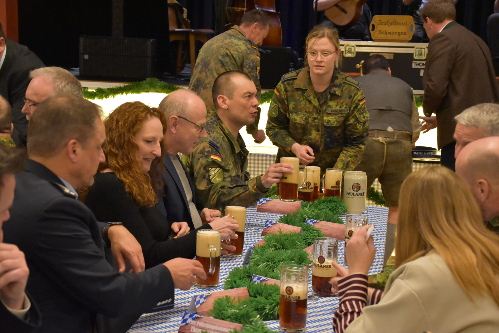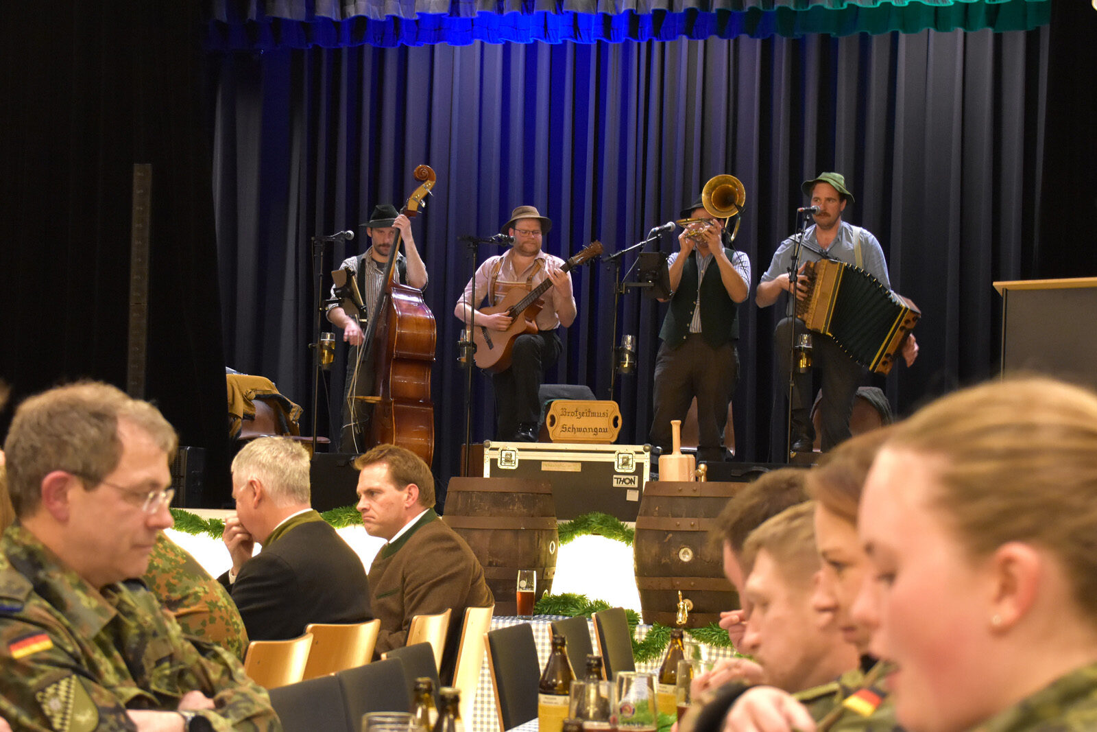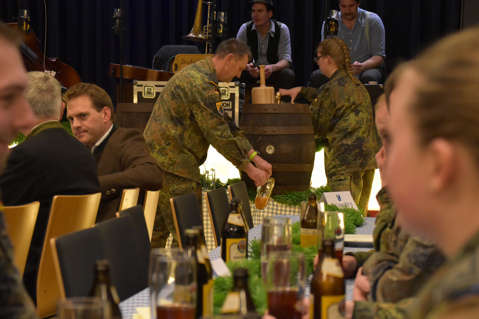 Der traditionelle Starkbieranstich des Bundeswehrstandortes in Füssen zum Auftakt in die Fastenzeit zählt bereits früh im Jahr zu den Höhepunkten im Veranstaltungskalender unserer OASE – Haus der Gebirgsjäger. Auch in diesem Jahr fanden am 19. Februar – auf Einladung des Versorgungsbataillons 8, des Aufklärungsbataillons 10, der Gebirgsaufklärungskompanie 23 und des Sanitätsversorgungszentrums Füssen – weit mehr als 200 Gäste im festlich geschmückten Saal der OASE zusammen, um der Eröffnung der Starkbierzeit beizuwohnen.
