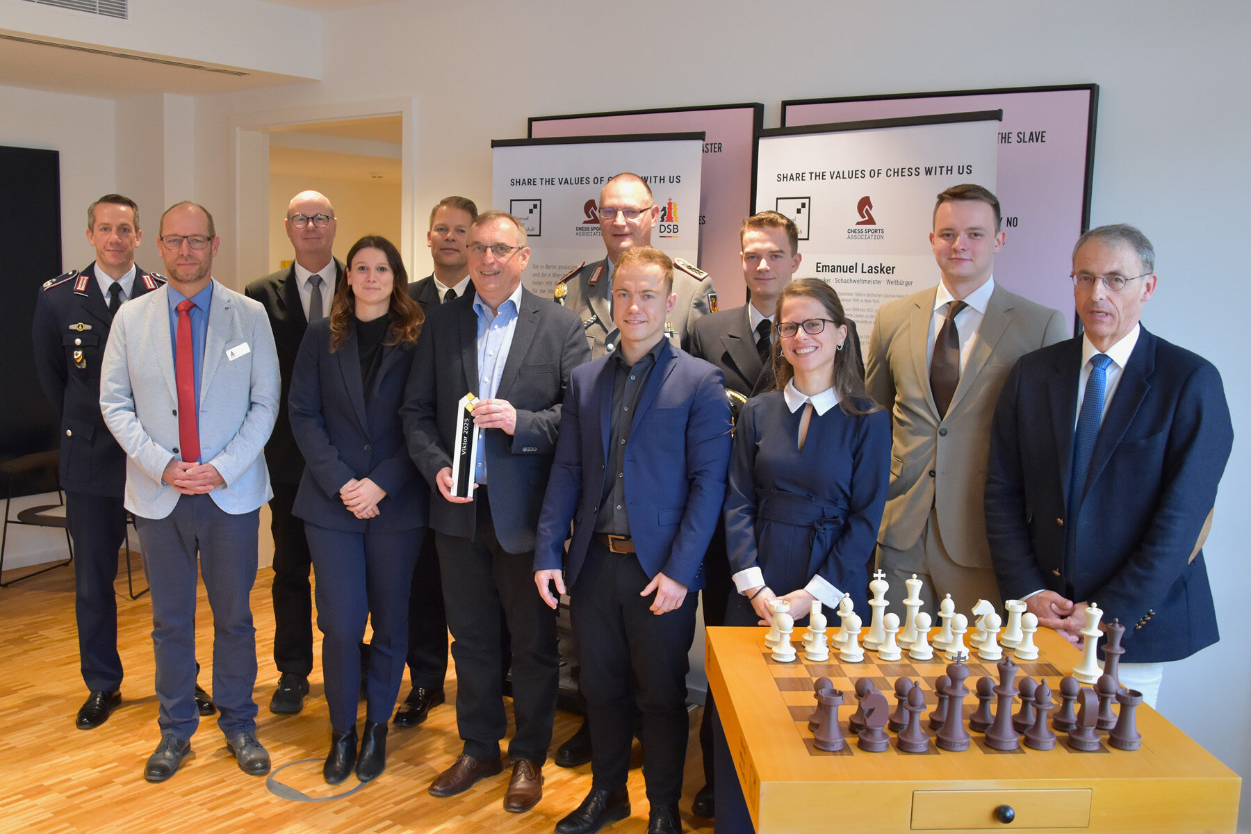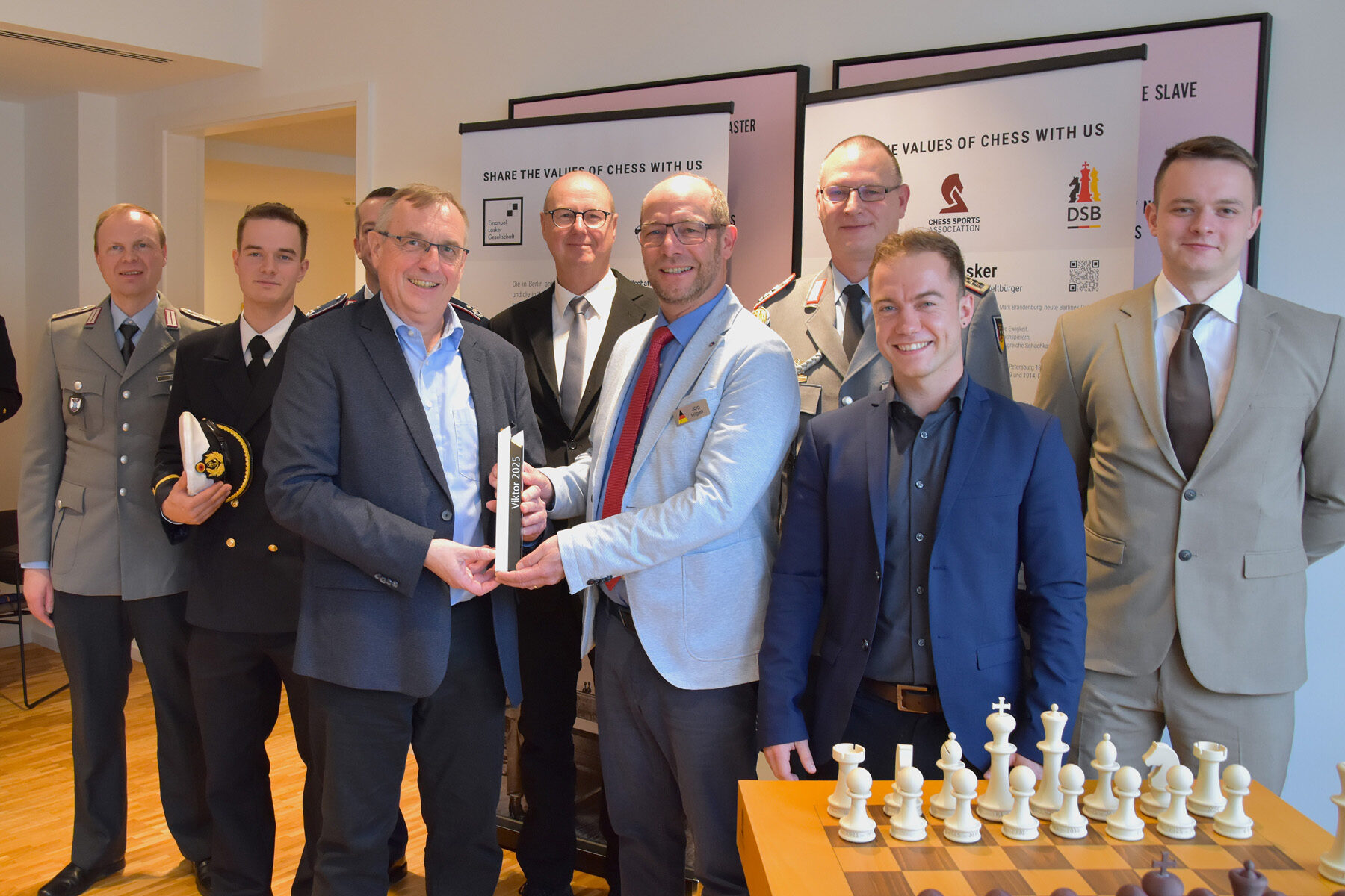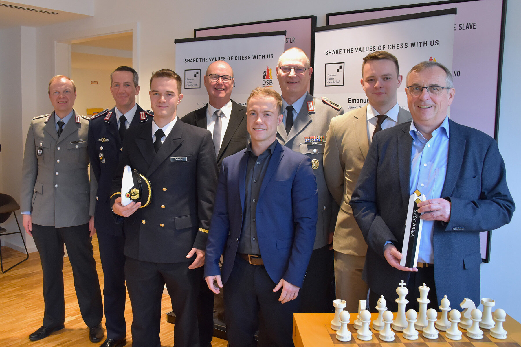 Für ihre herausragenden Erfolge und langjährigen Verdienste im Schachsport sind das deutsche NATO-Schachteam der Bundeswehr und die Katholische Arbeitsgemeinschaft für Soldatenbetreuung von der Emanuel Lasker Gesellschaft mit dem Viktor 2025 ausgezeichnet worden. Im Beisein des Referatsleiters für Betreuung und Fürsorge im Bundesverteidigungsministerium (SK III 5), Kapitän zur See Stephan Küttler, übergab der Vorstand der Emanuel Lasker Gesellschaft um ihren Vorsitzenden Thomas Weischede den renommierten Schachpreis an aktuelle und ehemalige Mitglieder der Bundeswehr-Schachauswahl sowie an den verantwortlichen KAS-Projektleiter, Jörg Hilgert.