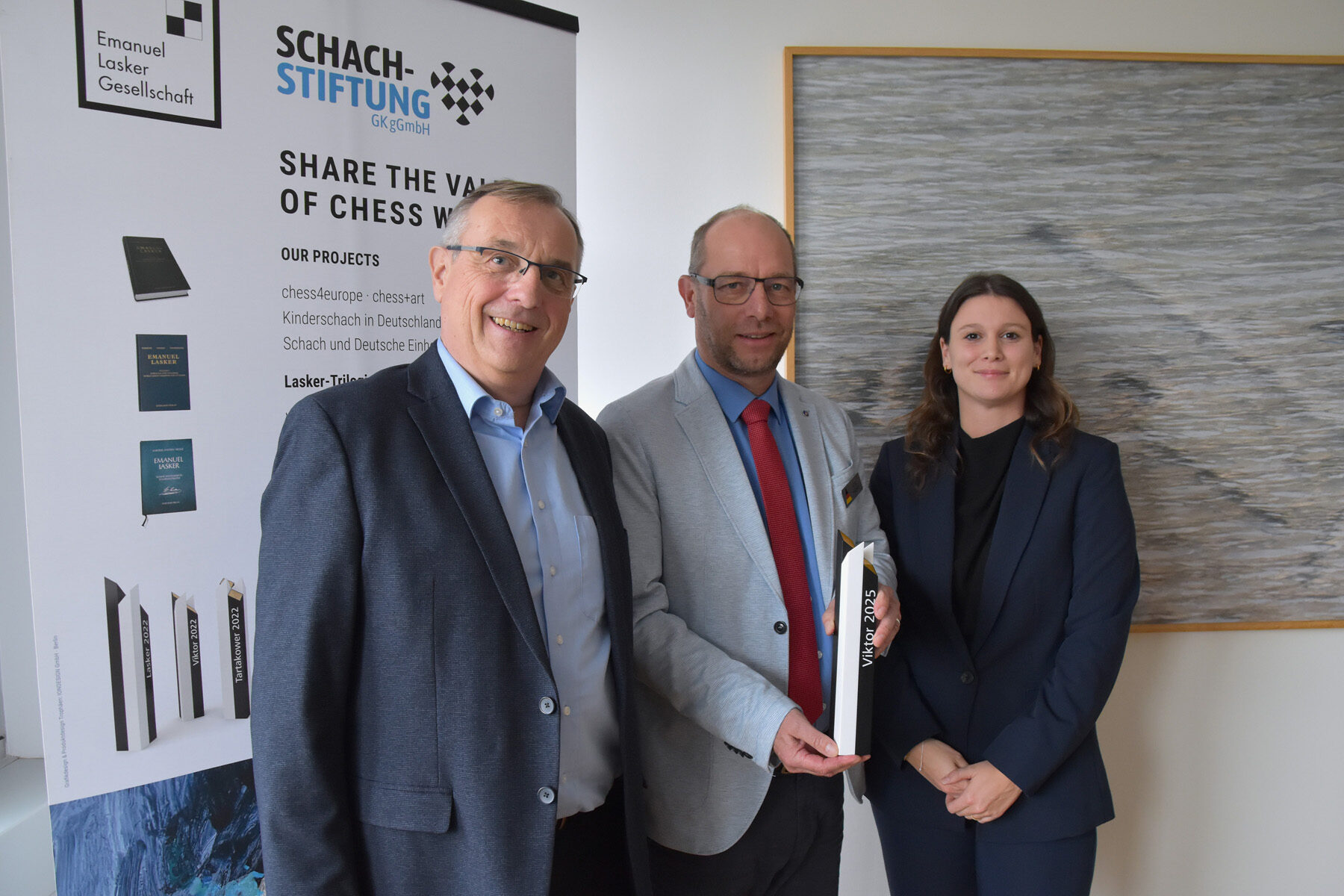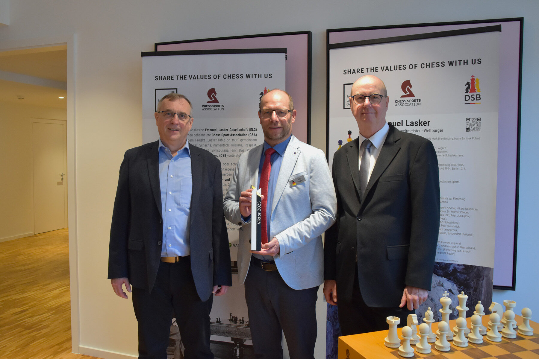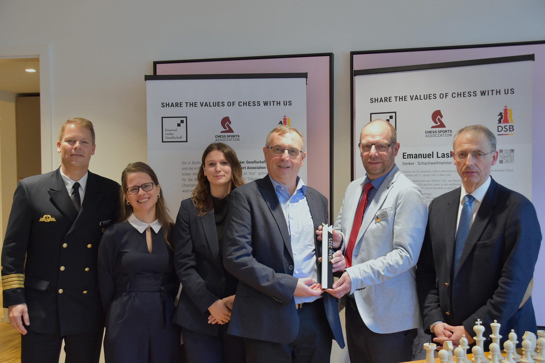 Für ihre herausragenden Erfolge und langjährigen Verdienste im Schachsport sind das deutsche NATO-Schachteam der Bundeswehr und die Katholische Arbeitsgemeinschaft für Soldatenbetreuung von der Emanuel Lasker Gesellschaft mit dem Viktor 2025 ausgezeichnet worden. Im Beisein des Referatsleiters für Betreuung und Fürsorge im Bundesverteidigungsministerium (SK III 5), Kapitän zur See Stephan Küttler, übergab der Vorstand der Emanuel Lasker Gesellschaft um ihren Vorsitzenden Thomas Weischede den renommierten Schachpreis an aktuelle und ehemalige Mitglieder der Bundeswehr-Schachauswahl sowie an den verantwortlichen KAS-Projektleiter, Jörg Hilgert.