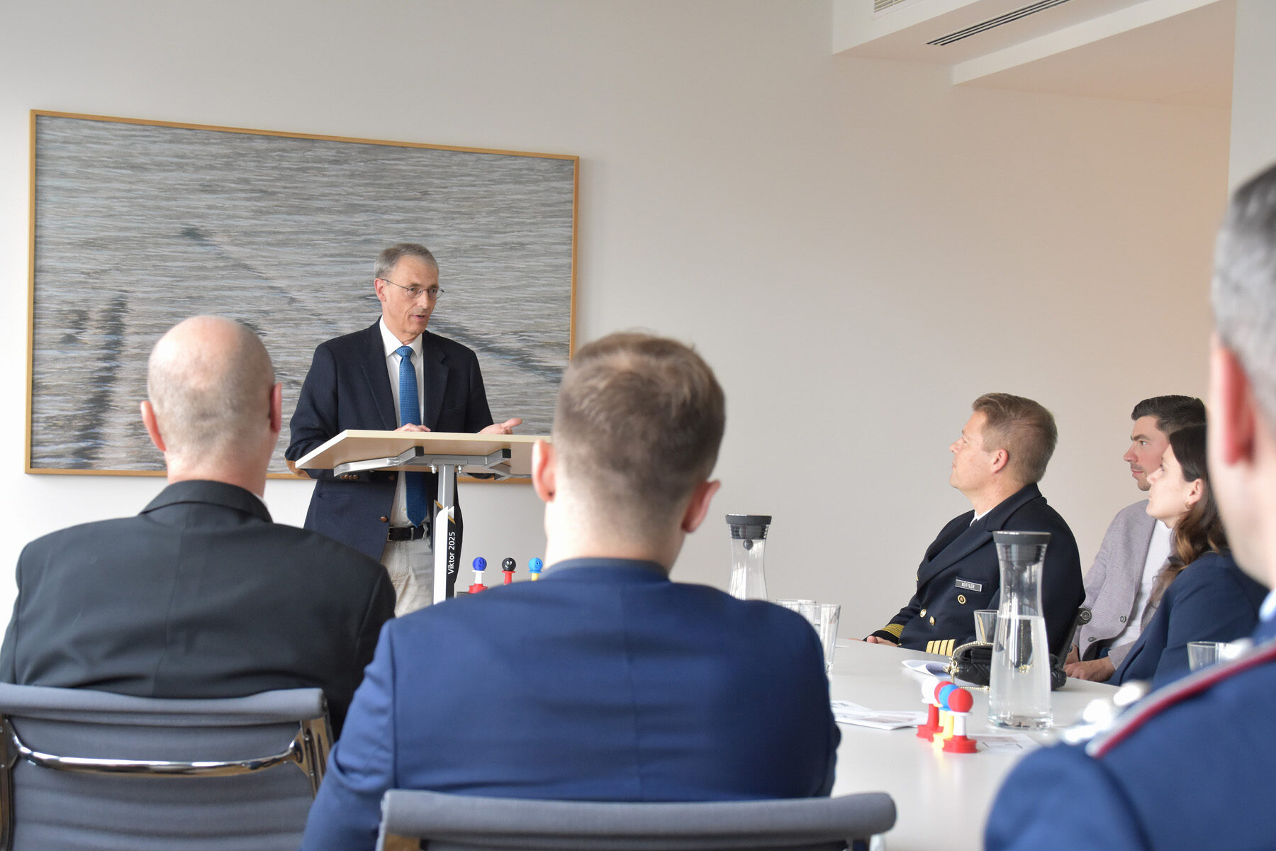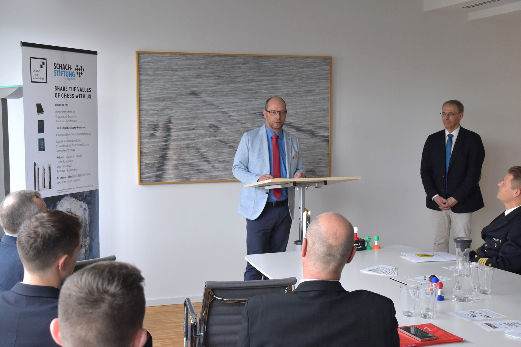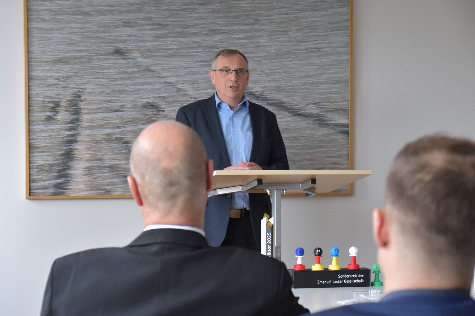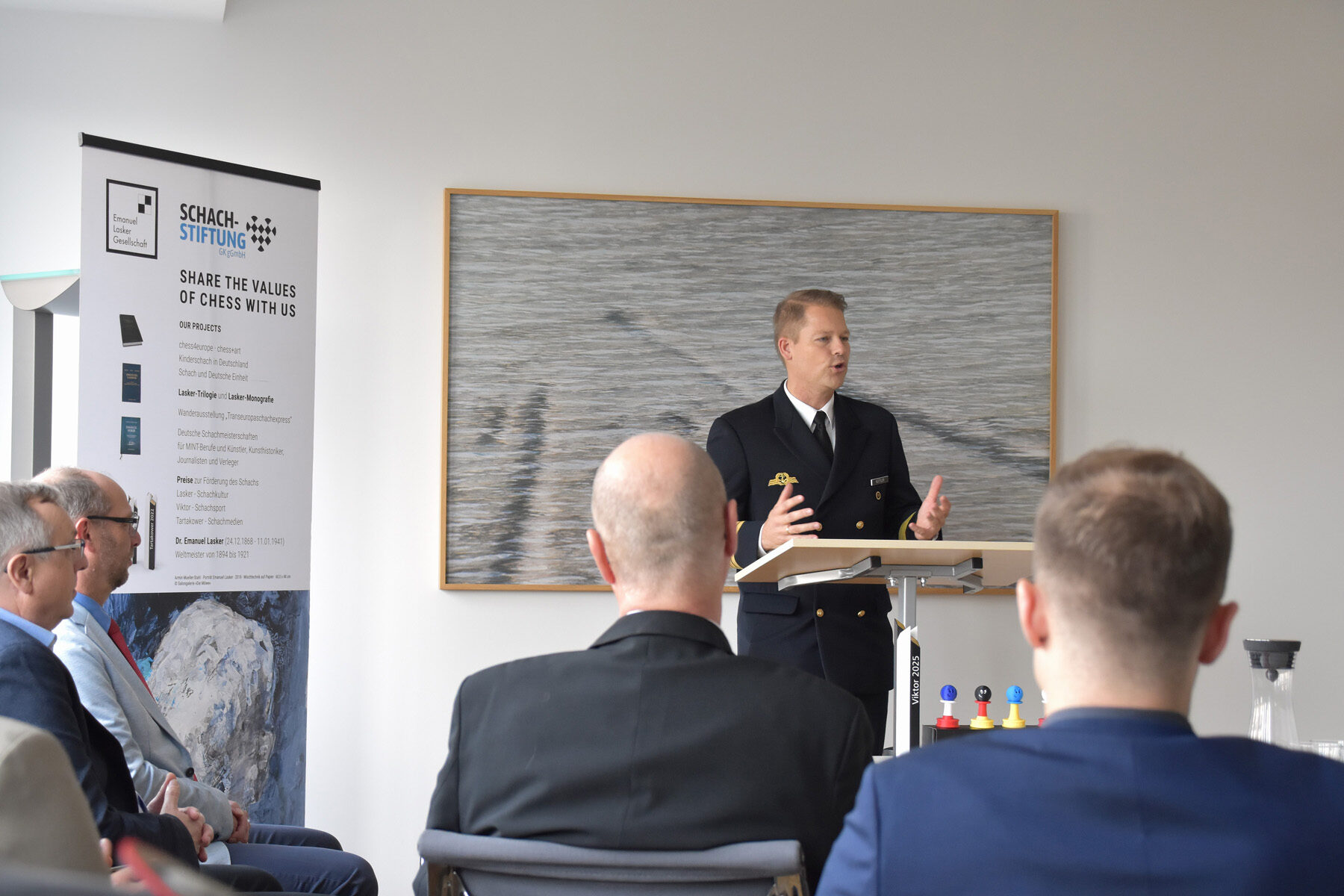 Für die Würdigung der herausragenden Leistungen der Bundeswehr-Schachauswahl und der KAS sprach Kapitän zur See Stephan Küttler auch im Namen des Verteidigungsministers Boris Pistorius der Emanuel Lasker Gesellschaft seinen herzlichen Dank aus. Diese Form der Wertschätzung „zeigt sichtbar gesellschaftliche Verbundenheit mit den Leistungsträgern der Bundeswehr und gibt ihnen Rückhalt,“ so Küttler in seinem Grußwort. Mit ihrer Entscheidung setze die Emanuel Lasker Gesellschaft somit auch ein wichtiges gesamtgesellschaftliches Signal. Zugleich würdige sie mit dem Viktor 2025 ein charakterstarke Mannschaft, die „seit Jahrzenten ein herausragender Botschafter für die Bundeswehr in Deutschland im internationalen Umfeld“ ist, Brücken baue und Verbindungen über Grenzen hinaus schaffe, machte Küttler deutlich.